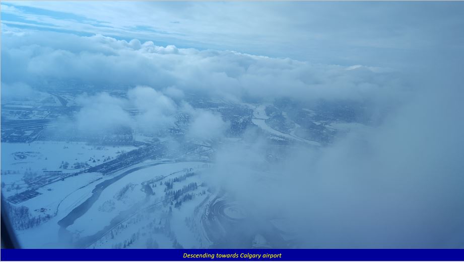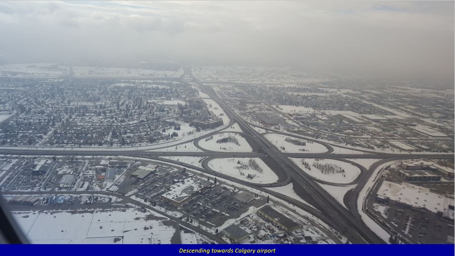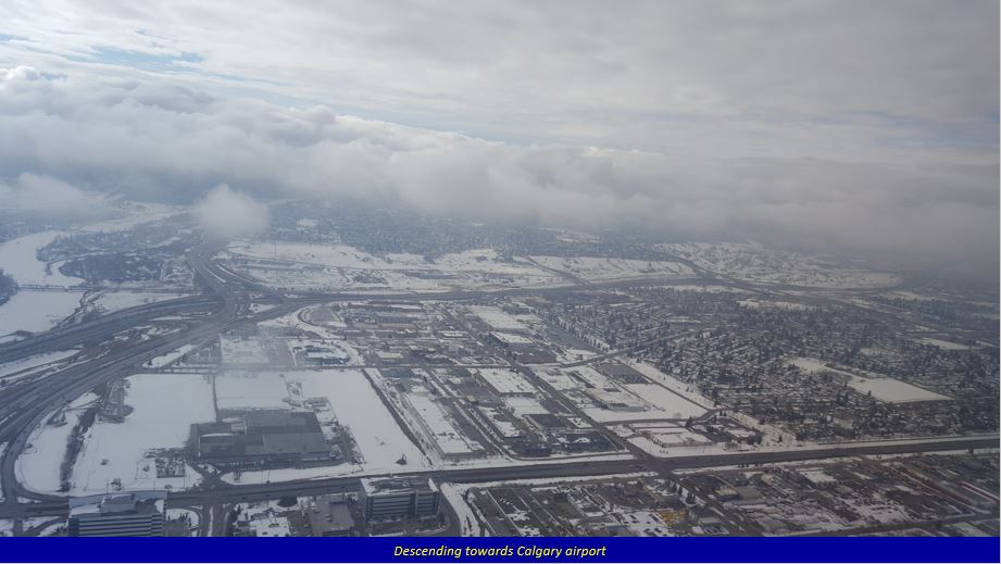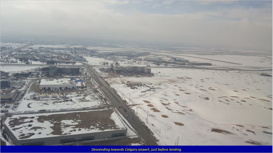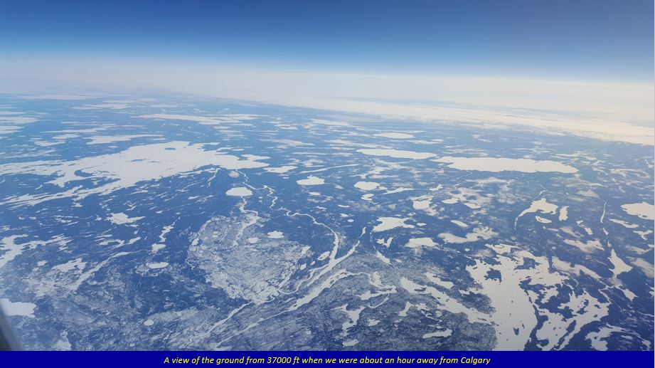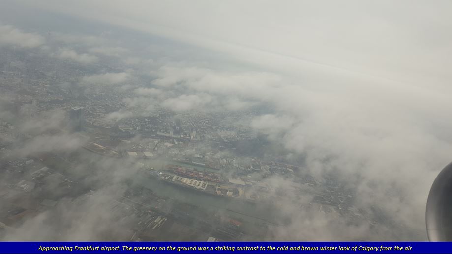 I had a long layover (6.5 hours) at Frankfurt, and so relaxed in the lounge, watching a couple of movies. The next flight to Calgary was delayed by over an hour, as strong winds were gusting over the runway, and as the captain said, they were advised to wait. Once the plane took off, the flight was smooth throughout. After a long 9-hour flight we finally arrived to cold snowy Calgary.