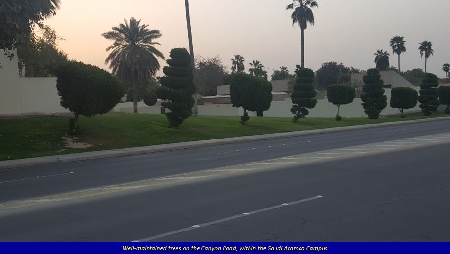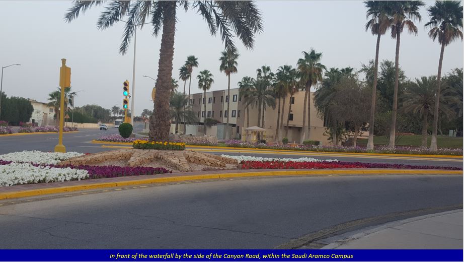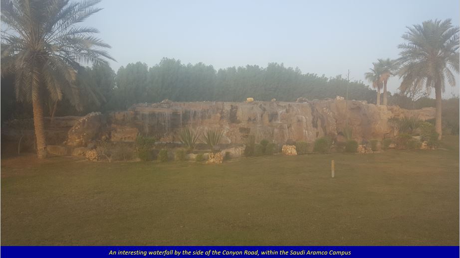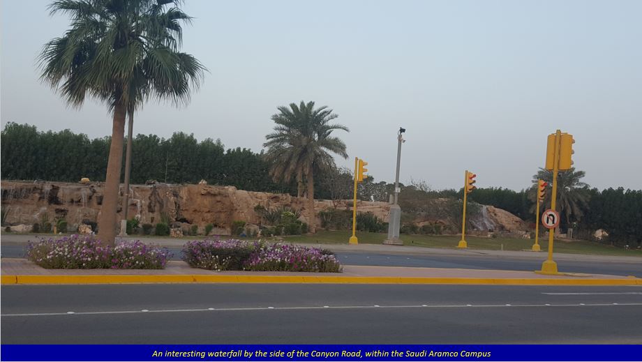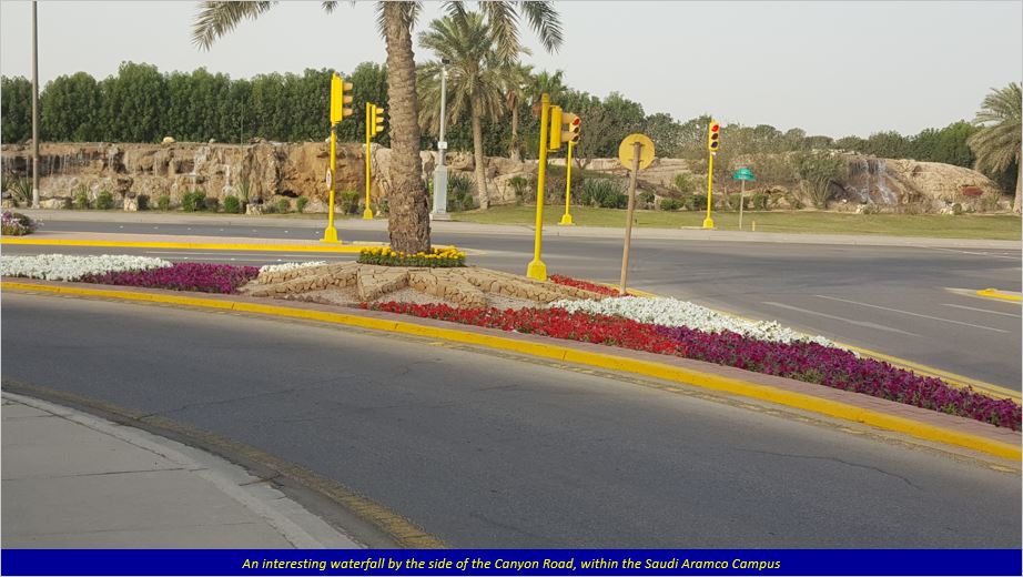 Along the Canyon Road, the morning traffic is slower, and the trees standing on both sides of the road are well-maintained, with flower beds at many places blooming flowers giving a colourful look. There is also a nice landmark (called Jubail, as I was told by a passerby) of a not-so-tall waterfall from a rock, at the crossing of Canyon Road and Miller Road. The photos below explain it all. It is to Aramco’s credit that they have maintained their Campus so well. The majestic Mercedes Benz luxury coach buses plying on the campus roads is a common sight, and are available quite regularly.