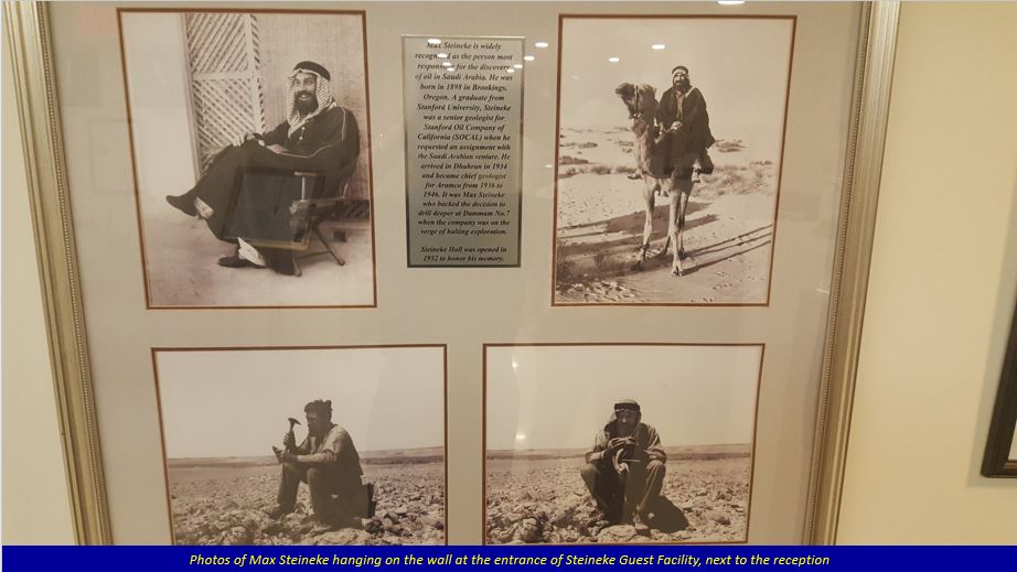 Steineke Hall guest residence is situated on Saudi Aramco campus, and is very convenient to get to the offices, wherever the work assignment is. The residence is dedicated to Aramco’s famous pioneer, Max Steineke, and originally (opened in 29th June, 1952) consisted of 23 rooms. Over the years, it has seen many renovations, and today has 123 rooms. Some framed pictures of Max Steineke hand at the entrance of the residence, near the reception.